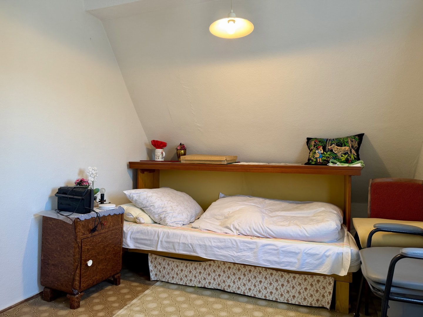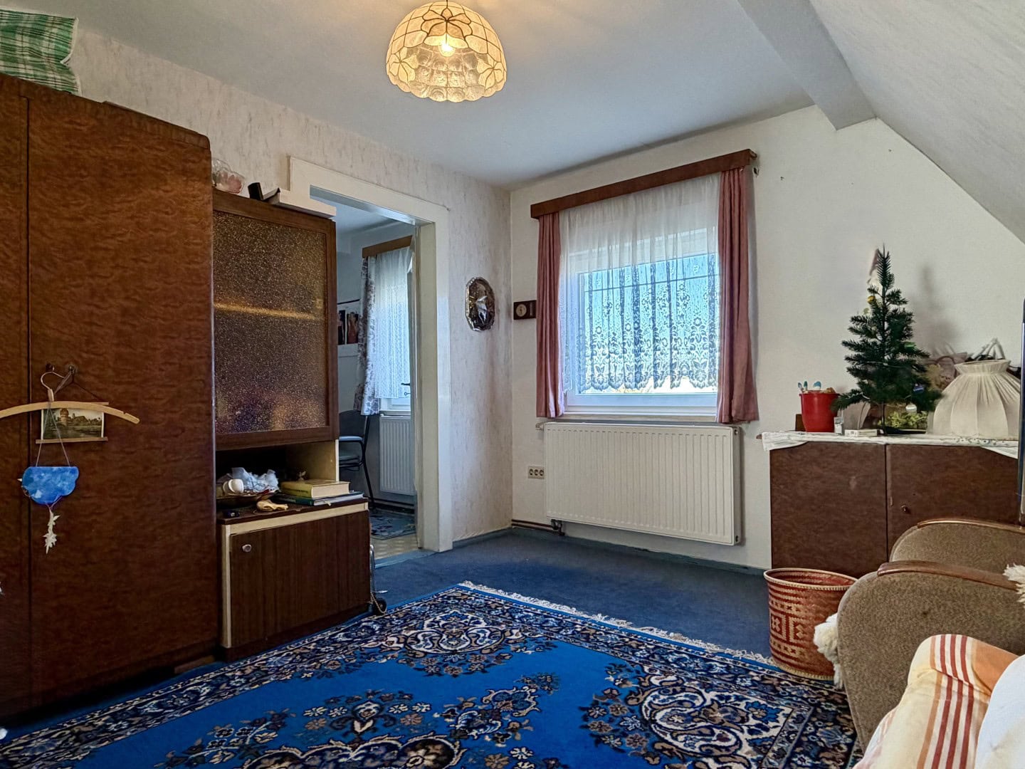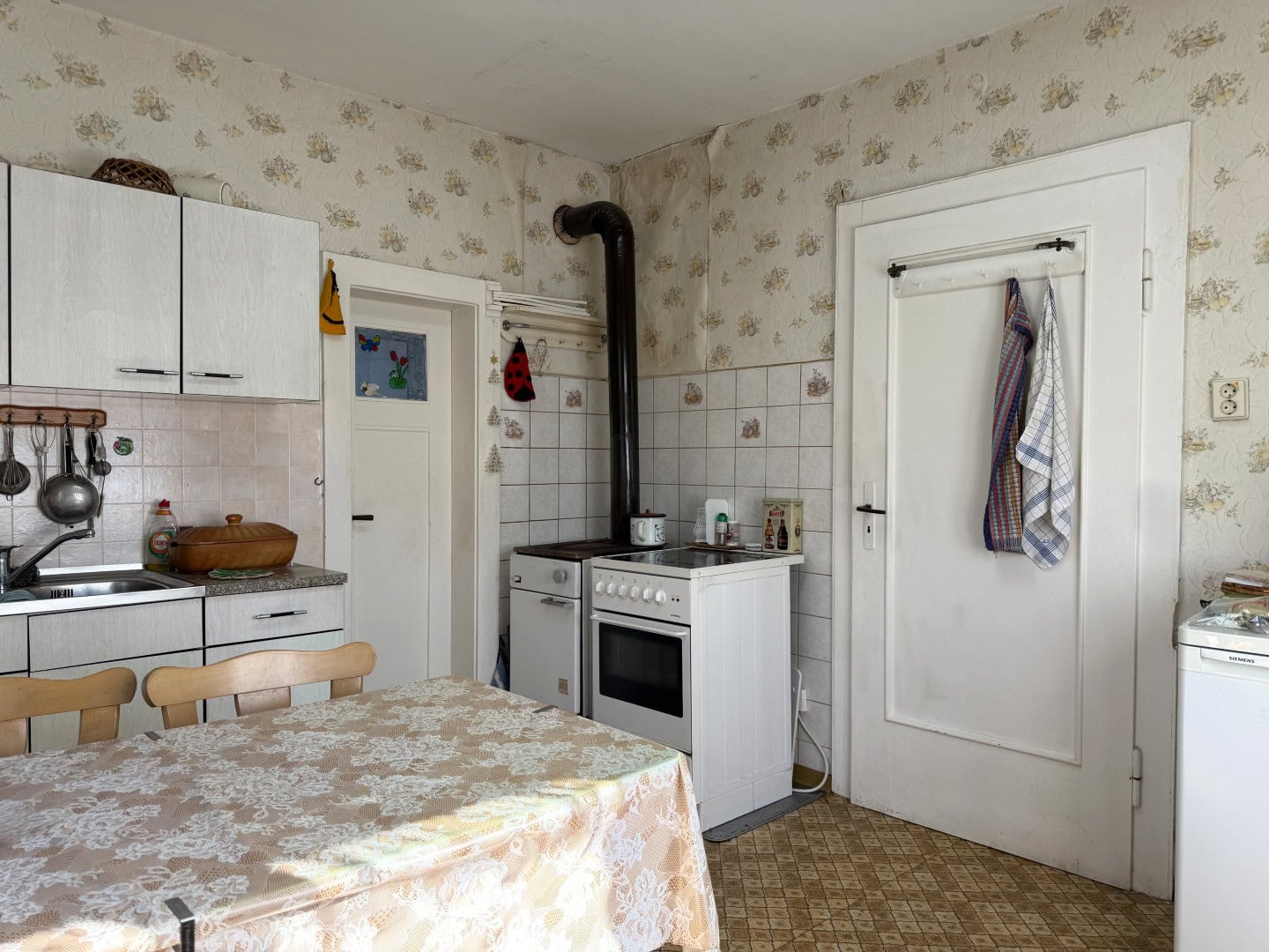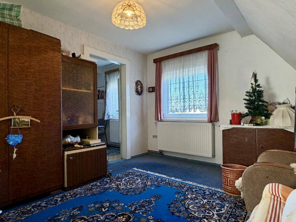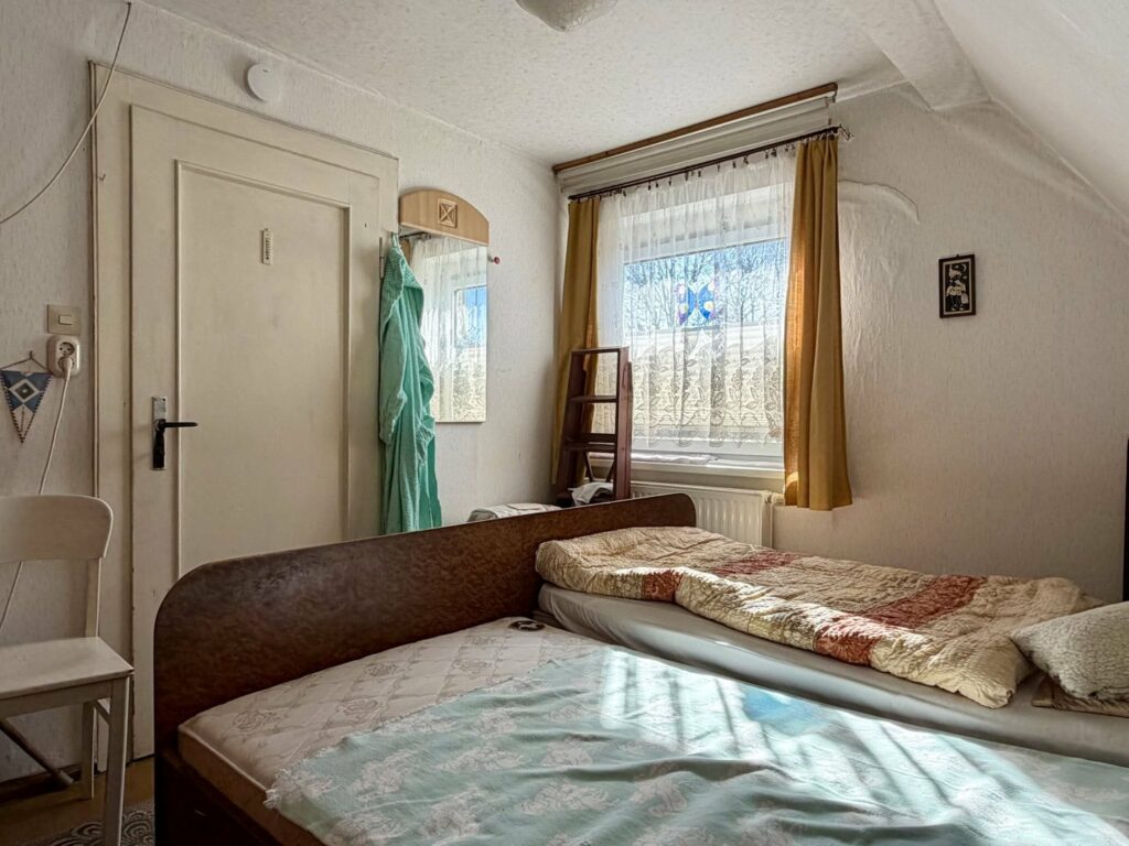 Das um 1937 errichtete Einfamilienhaus verfügt über eine Wohnfläche von etwa 70 m² und bietet eine solide Grundlage für individuelle Wohnideen. Im Erdgeschoss gelangen Sie vom Flur aus in die Küche sowie in das Wohnzimmer. Das Badezimmer erreichen Sie bequem von beiden Räumen. Einige Fenster wurden bereits durch moderne, doppelt verglaste Holzfenster mit Außenrollläden ersetzt.